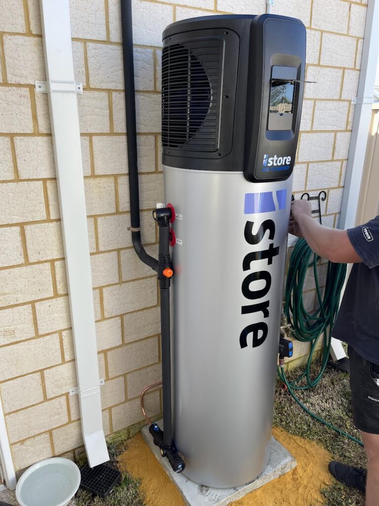 We recently completed the installation of an iStore heat pump hot water system in Morley, replacing an outdated gas hot water system. This new system will seamlessly integrate with the home’s existing solar power system, allowing it to run efficiently during the day on solar energy, providing hot water at no extra cost.
